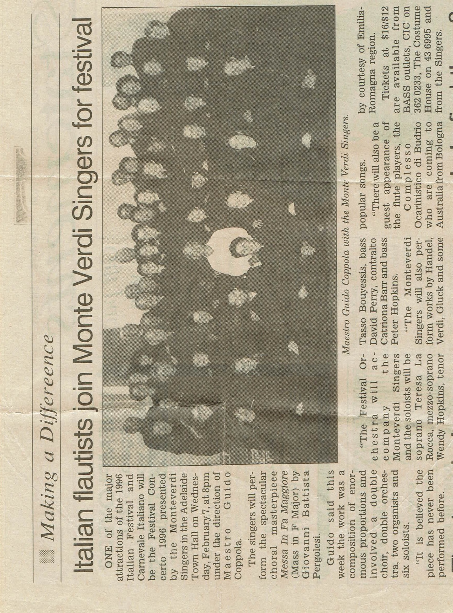 Iolanda sung in the Monti Verdi Singers for many years. In 1996 the group performed as part of the Italian Festival together with the Festival Orchestra and Italian flautists. They performed the Messa in Fa Maggiore by Giovanni Battista Pergolesi. Here is a newspaper clipping article of the same:
